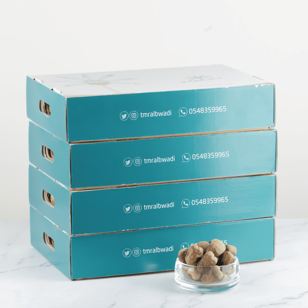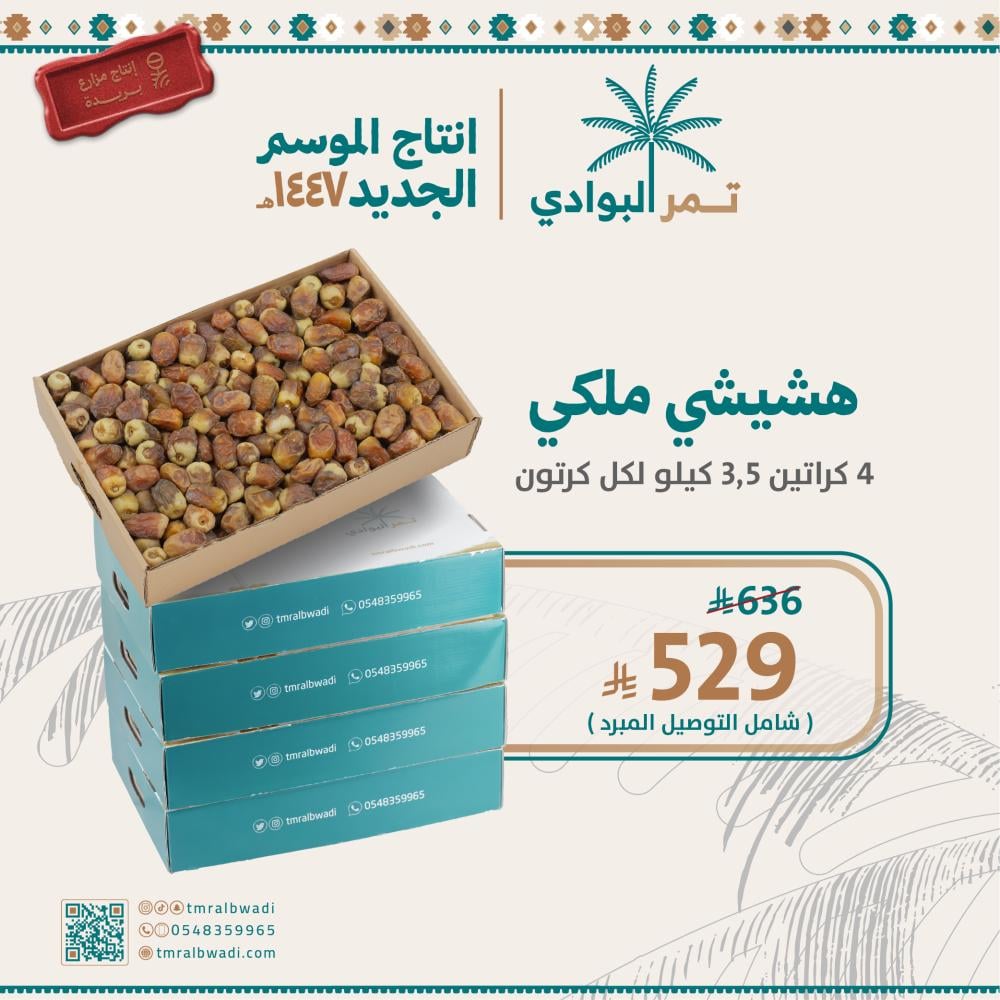 - 4 كراتين هشيشي ملكي من مزارع في منطقة الشيحية في بريدة والمعروفة بجودة التمر السكري وكبر حجم التمر على مستوى المملكة.